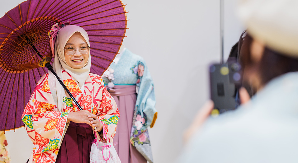 神戸の異国情緒あふれる街並みや洋館が出現した時代に、女性の間で流行した「ハイカラさん」ファッションを体験できるプログラム。20分のシンプルな着付けから一時間かけて行う本格体験のほか、書生スタイルの着付け体験も実施。着付けは地域の講師陣が丁寧にサポート。