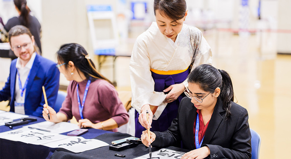 袴を履いた講師が、筆の持ち方や使い方など基礎から丁寧に教え、うちわや半紙に文字を書いて作品を仕上げるワークショップ。千年以上の歴史を持つ日本の伝統芸術を体験することができる。