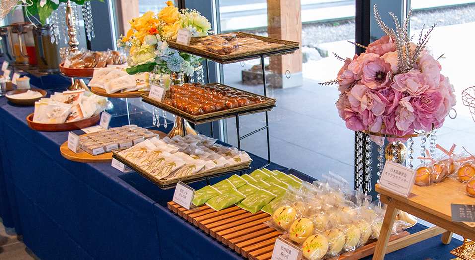 MICE開催中、芝⽣広場を⾒渡せるラウンジで、参加者に地域の銘菓を提供。屋外には東北のグルメを堪能できるキッチンカーを揃え、広⼤な⻘葉⼭公園の⾃然を感じながら、地域の特産品を堪能できる空間を作り出す。