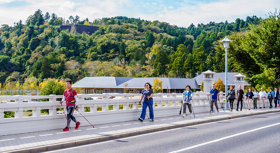 専⾨ガイドのレクチャーを受け、専用ポールを使⽤した理想的な歩⾏スタイルを習得。エクササイズをしながら⾃然、歴史、⽂化に触れ、⼼⾝ともにリフレッシュできる。