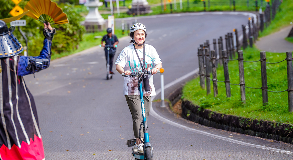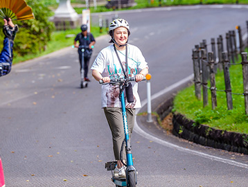 MICE参加者は電動モビリティに乗り、ガイドと共に地域の⽂化遺産や史跡、⾃然を巡る。新たな体験を通じて学び、地域への理解を深める。