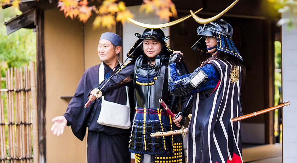 甲冑着付師から歴史的背景など甲冑の解説を聞き、戦国武将の本格甲冑を着⽤できるプログラム。仙台市指定有形⽂化財「残⽉亭」にて、プロのカメラマンによる撮影が可能。