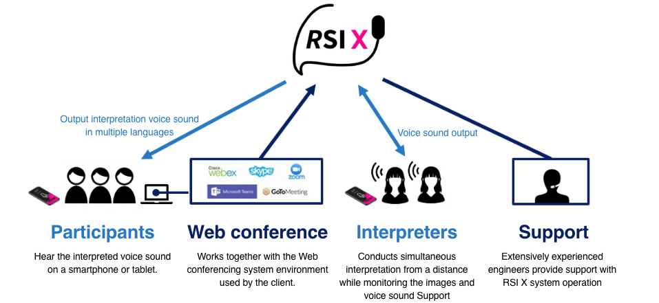 For consultations and inquiries on online interpretation that uses a Web conferencing system and remote simultaneous interpretation RSI X, please contact us.