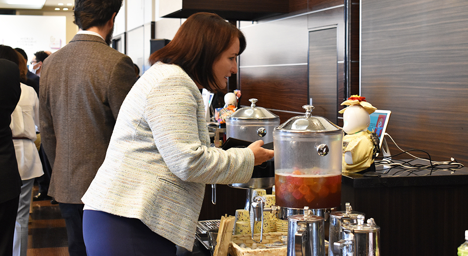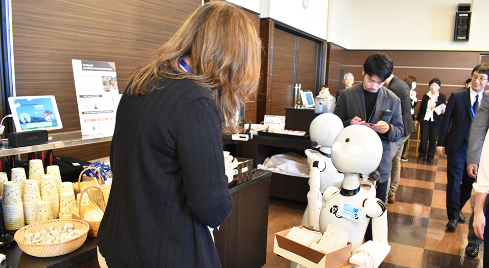 JCS was responsible for running the Digital Transformation Summit (DX Summit), which was held at HOTEL KOGURE (Shibukawa City) on Friday, April 28, before the Ministers’ Meeting. During the DX Summit, the remote-controlled OriHime robots, which were planned by the World Economic Forum, were in action. OriHime is an avatar robot remotely piloted by people confined to their homes on the website for various reasons, such as family commitments, disability, or illness. The robots allow the pilots to communicate as if they were physically present. Several OriHime robots were seen cruising around the venue during the breaks with drinks and Japanese sweets in hand, enjoying conversations with the participants.