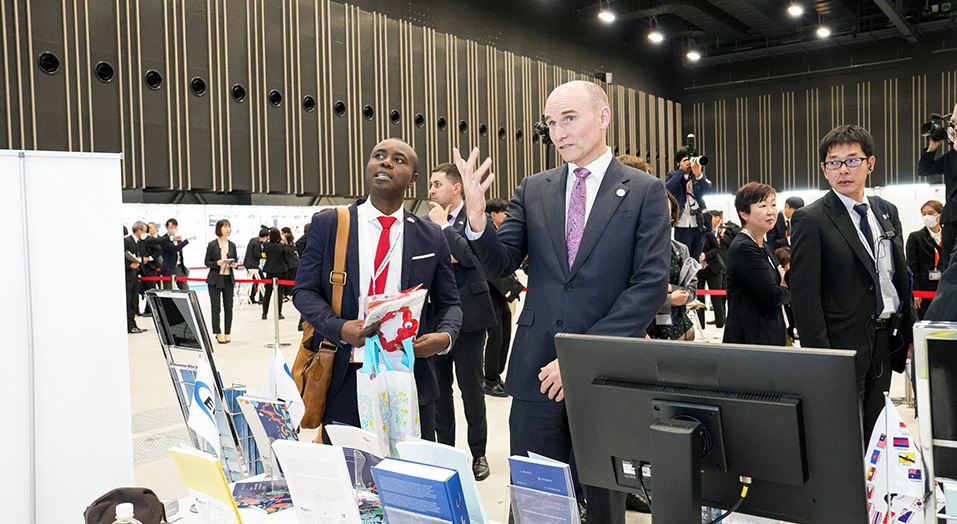 All ministers attending the meeting were accommodated at the Hilton Nagasaki adjacent to the meeting venue, Dejima Messe Nagasaki. This minimized car travel and reduced emissions. Inside, the venue was decorated to exude a uniquely Nagasaki atmosphere: wall hangings inspired by stained glass cathedrals added color to the spacious meeting room, and local cultural promotion associations pitched in with Nagasaki-produced floral art and the giant dragon puppet of Jaodori (Dragon Dance) placed at the entrance of the exhibition hall.