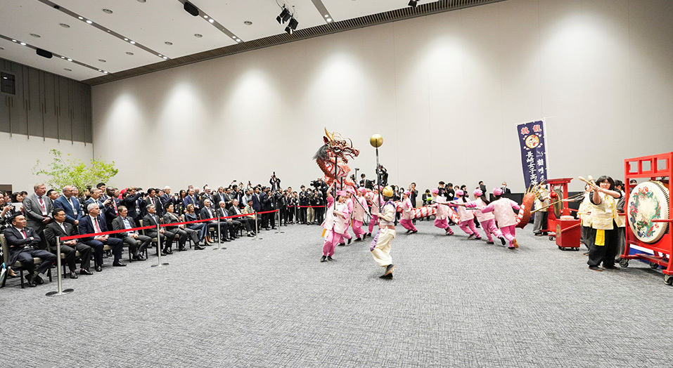 On the opening day, members of a local girls’ high school Jaodori team presented the powerful Dragon Dance, a traditional performing art of Nagasaki, at the reception hosted by Health Minister Kato. Nagasaki products and traditional crafts were displayed at the exhibition booths. Such cultural promotion and community revitalization will help to pass on the traditional performing arts and craftsmanship of Nagasaki to future generations.