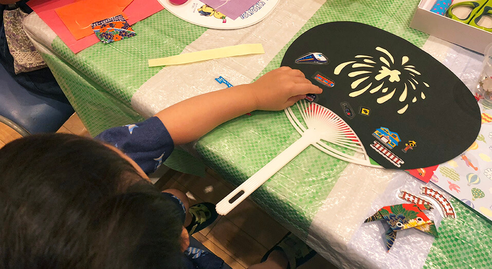 On August 4, the middle of the school summer vacation, we conducted the Uchiwa Fan Decoration Workshop inviting children and their parents to Sayama City Community Center (Saitama Pref.), a facility we operate and manage as a designated administrator company.