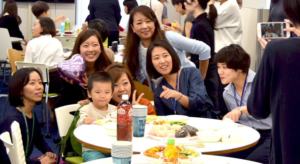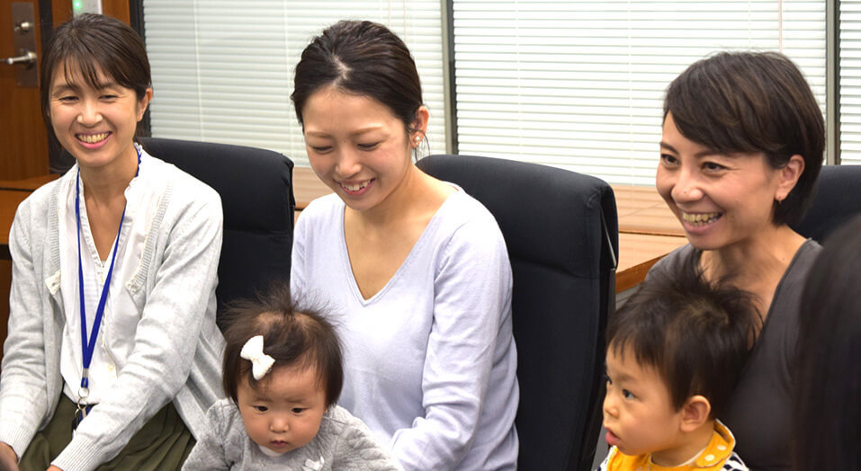 On October 4, mom employees who are on maternity leave and other senior mom employees gathered at the head office for the JCS Mom Café, a discussion group to share the worries of child-rearing and help for a smooth return to work.