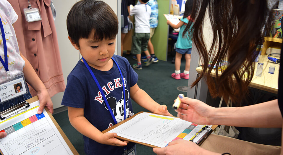 This is an activity that uses “Approval Documents,” which are familiar to adults. Children take the documents to the staff or board members at the designated desks to get their seals of approval, one by one. Children learn that they can get permission to buy what they want when collecting all things required, which is a sort of experience of the adult world.