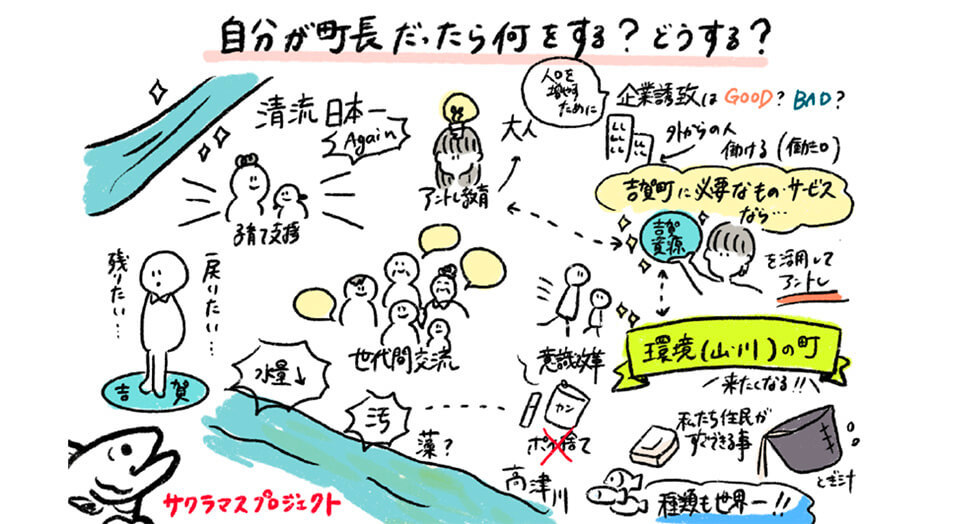 Twenty students from Kojimachi Junior High School thought of what they can do to help achieve the 17 Sustainable Development Goals (SDGs), thereby achieving a sustainable world; they also discussed the various current global issues. The content of their discussion was recorded in real-time using a technique called graphic recording that archives dialogues in real time in the form of figures and words, and then, by visualizing the ideas, they gained a deeper understanding of the SDGs.