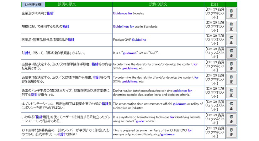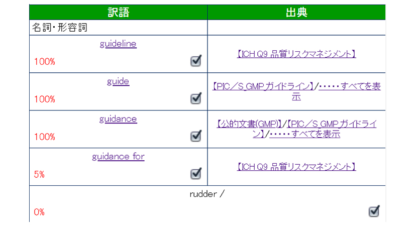 訳語が使われている訳例が出典元付で数多く表示されるため、専門分野ごとの訳語の使い方や表現方法を確かめることが可能です。また、出典元には多数の国内外の公的文書・ガイドラインなどが含まれているので、訳語の正確性の裏付けをとる手がかりになります。