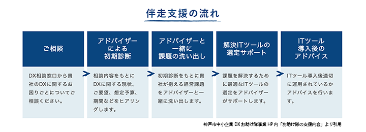 このような状況から脱却してビジネス変革を図りたい中小企業を対象に、神戸市は2021年6月から、「神戸市中小企業DXお助け隊事業」を開始しました。多種多様な神戸市の中小企業に対して、デジタル技術で経営課題の解決や事業転換、業務改革の支援を行っています。