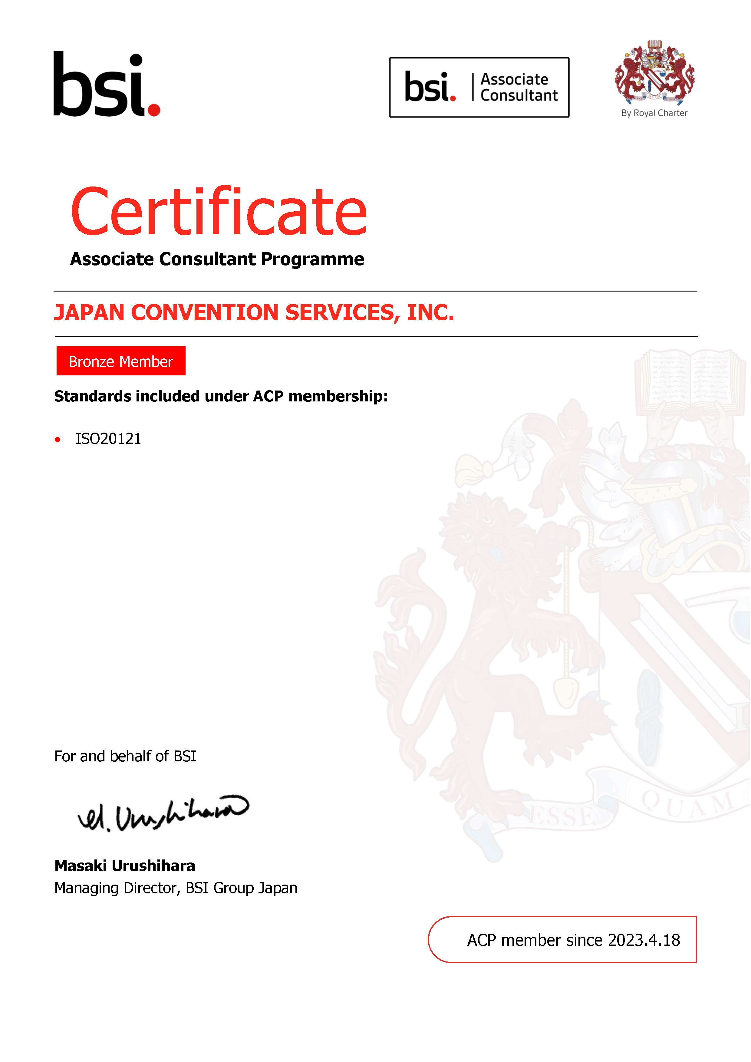 当社は「ISO20121」イベントサステナビリティ認証では日本で初めて、BSIジャパン社のアソシエイト・コンサルタントに選定されました