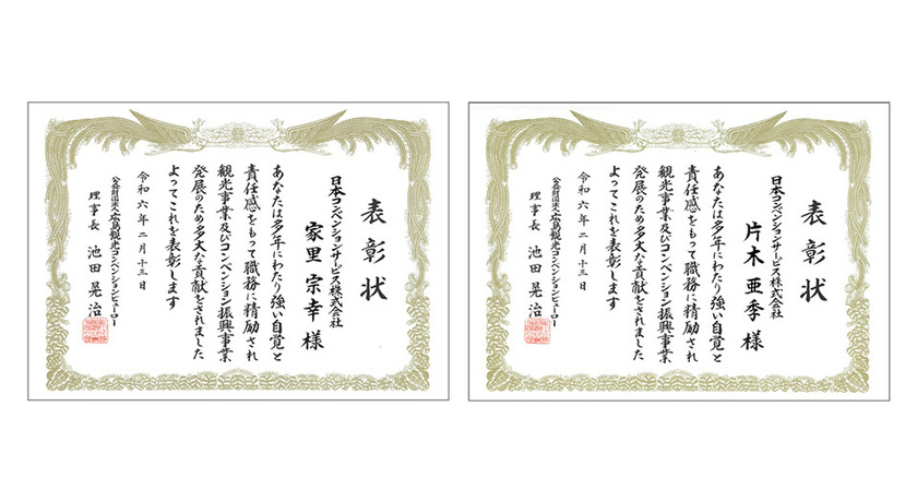令和5年度「優良従業員表彰式」が、2月13日(火)にリーガロイヤルホテル広島で開催され、当社関西支社の家里 宗幸社員と本社ミーティング・イベントデザイン事業部の片木 亜季社員が「広島観光コンベンションビューロー優良従業員表彰者」を受賞しました。