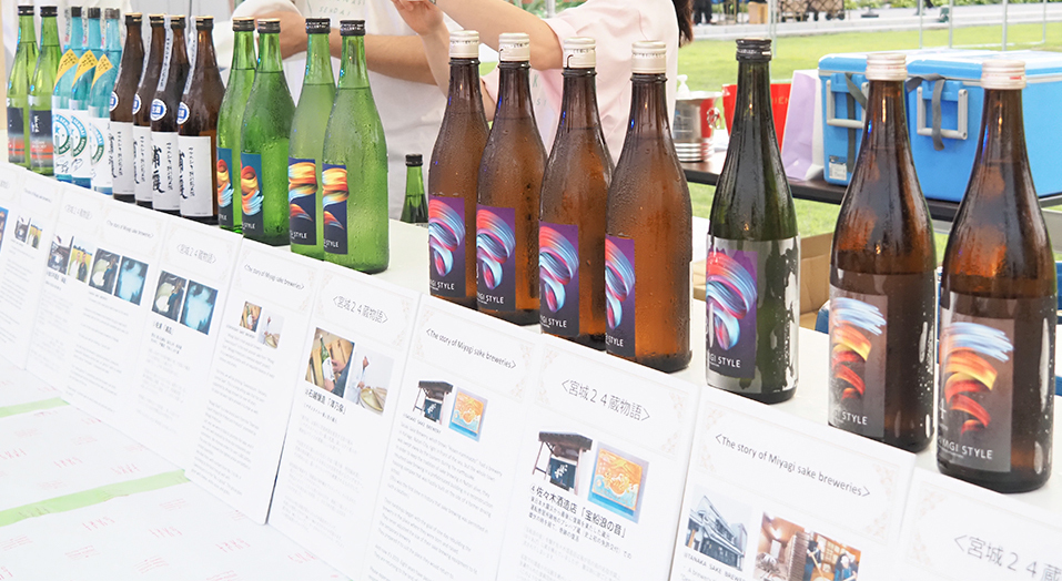 今回のPark MICEのメインコンテンツである懇親会。会場は、青葉山公園内にある仙臺緑彩館の立地を活かした、広大な芝生広場で開催しました。会場にはピンクリボンをモチーフにしたオブジェやステージを設置し、ステージではジャズバンドによるミニコンサートも開催しました。このほか仙台七夕や伊達政宗公など、仙台にちなんだコンテンツを使ったライトアップや、夏の夜空を彩る打ち上げ花火も実施しました。市民ボランティアが接遇する「県内酒造の日本酒利き酒ブース」では宮城県内の酒造メーカーが作る24種類の日本酒を提供。ブースには絶えることなく人の列が続きました。