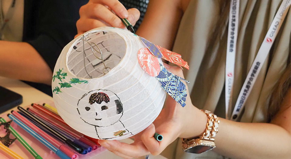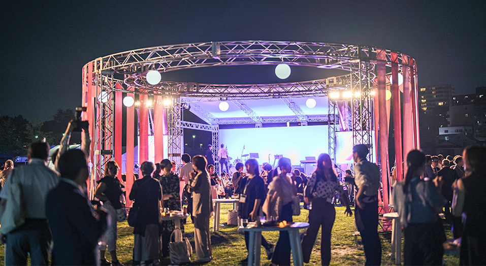 初開催となる今回は、ライトアップイベントや打ち上げ花火など、仙臺緑彩館の広大な芝生広場を活かした解放感あふれる夏らしい演出のほか、地元の利き酒ブース、仙台七夕にちなんだ和紙アート作り、仙台市指定有形文化財で記念撮影する茶道&和装体験など、開催地仙台ならではのプログラムを実施。空間デザインとライトアップは、当社グループ会社Dorier Japan*2が担当しました。また、市民と学会参加者をつなぐメッセージボードも設置し、双方の交流につなげました。