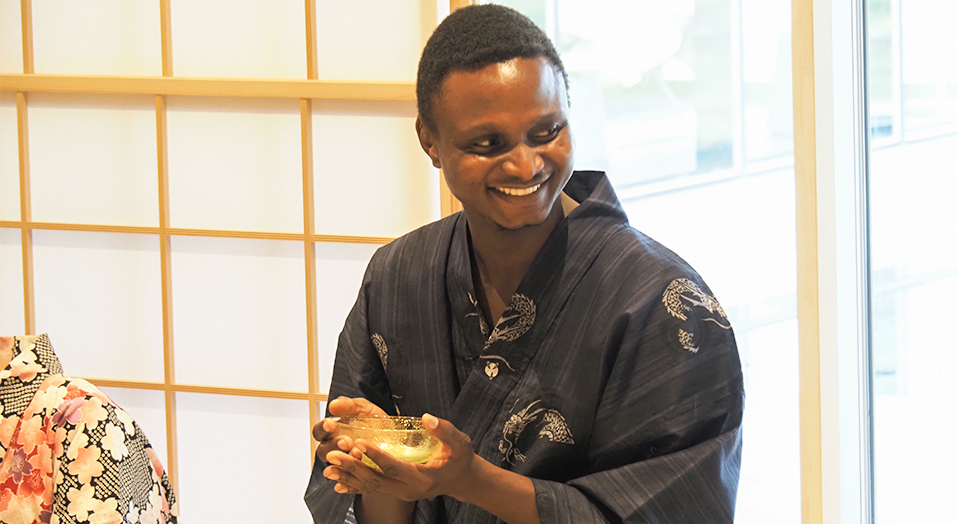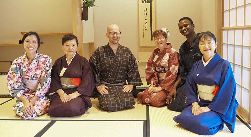 市民ボランティアが講師となり、学会参加者の方にも市民の方にも楽しんでいただける、文化体験プログラムを実施。プログラムでは扇子や提灯作りなど、日本文化を楽しめる作品を作りました。また茶道&和装体験では、庭園を見渡せる仙臺緑彩館の和室で和装の着付けと薄茶をたてる茶道体験を行った後、仙台市指定有形文化財の残月亭で記念撮影を行い、海外からの参加者にも日本文化を楽しんでいただきました。