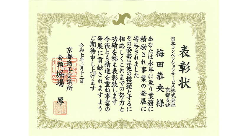 当社は京都商工会議所に加入しており、本表彰は京都商工会議所の会員企業、または団体に永年継続して勤務し、事業の繁栄や社業の発展に貢献した従業員を対象に表彰するものです。