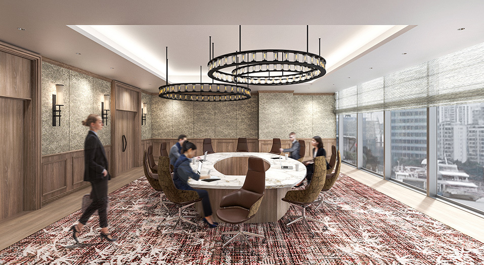 歓談や休憩等、会議のオフタイムに寛げる空間を提供。和と洋のテイストを掛け合わせたオリエンタルなインテリアデザイン