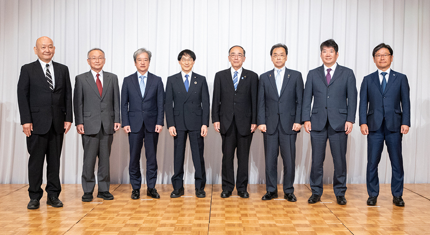 ※上記写真は左から、山香病院・小野院長、コスモス病院・下田院長、大分大学・髙橋教授、大分大学・北野学長、臼杵市・中野市長、杵築市・永松市長、JSR・吉本執行役員、JCS・近浪社長