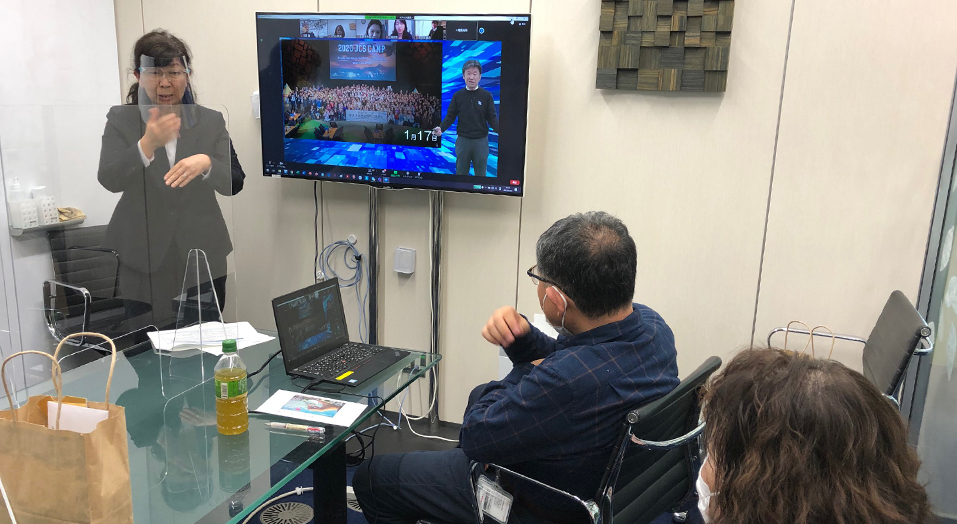情報保障とは、障がいのある人に必要なサポートを行い、適切な情報を提供することを指します。聴覚障がいを持つJCS社員は、手話通訳を使ってグループゲームを含む全てのプログラムに参加しました。社員全員が参加できる環境を作ってコミュニケーションを支援することは、SDGsの核にある「誰一人取り残さないことを誓う」を体現するための重要な取り組みになります。