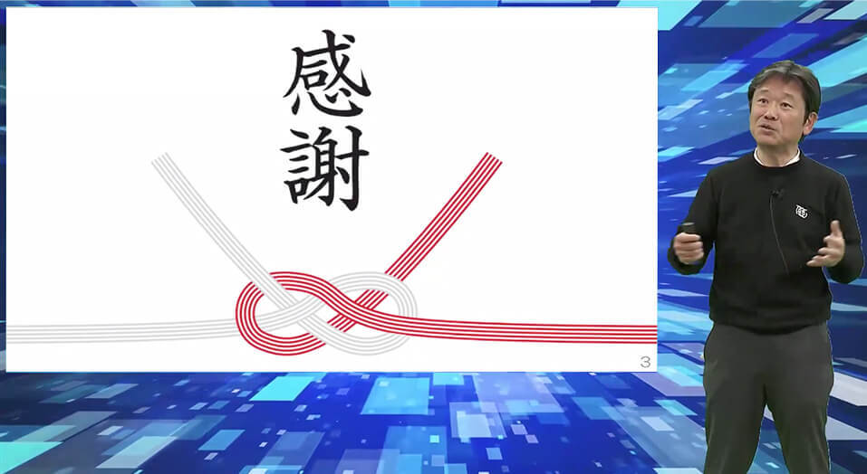 社長講話は、演者とスライドを同時出力する「2画面レイアウト」でライブ映像を配信。社員全員にチャット機能(コメント入力)を許可すると、ライブ中に社員同士が意見を投稿したり対話を楽しむことが可能になります。リアルな会場だと発言に勇気がいる場合もありますが、オンライン環境だと「気軽に発言できる」メリットがあるので、講演の場でも社員同士の “インタラクティブなコミュニケーション”が見られました。