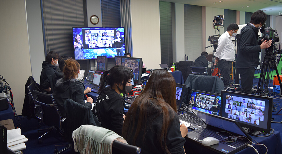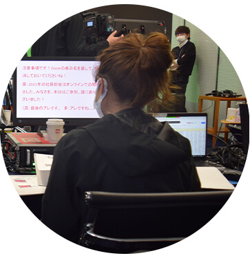 これまでは、ホテルや国際会議場などで開催していた社員総会。2021年1月は、会場を一切使用しない「オンライン社員総会」に初めて切り替えました。社内の会議室スペースに本格的な「配信スタジオ」を設営し、オンラインイベント用の映像機器やカメラ機材を手配してライブ映像を配信。参加者の社員は、自宅・外出先など、好きな場所からリモートで参加しました。