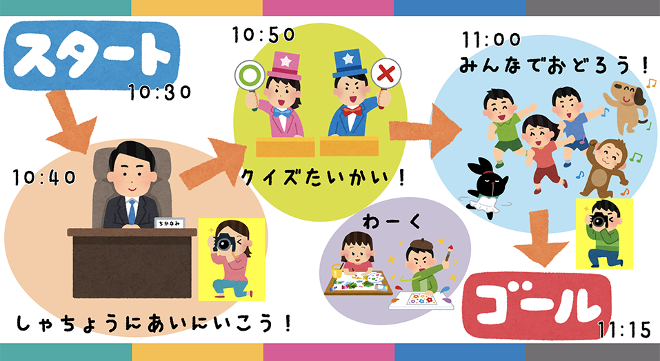 「クイズ大会」は、事前に配った“回答シート”をWeb会議システムの画面越しに提示して、その場で正解者を発表。クイズに参加できない小さなお子さんには、特製のワークグッズを配布し、一緒に楽しみました。「みんなで踊ろう!」は、家族参観日を担当する実行委員メンバーが、特技の“ダンス”を活かした企画を実施。画面上には家族みんなが体を使って盛り上がり、子ども達が楽しむ様子が映し出されました。
