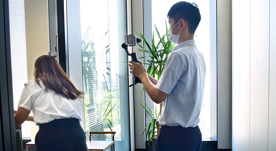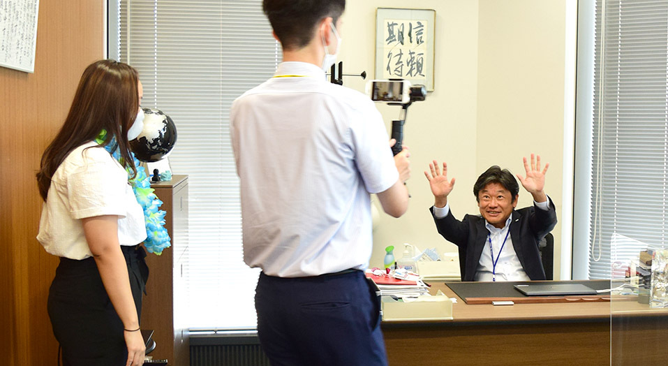 JCSの家族参観日では、恒例プログラムとして子ども達が近浪と名刺交換します。しかし今年は、オンラインを活用した企画内容に変更。2021年入社の新卒社員がレポーター役を務め、本社のエントランスから社長室に繋がるルートをたどる「テレビ中継」のような演出で、ライブ映像を配信しました。社長室に着いたら、オンライン経由で挨拶を交わします。