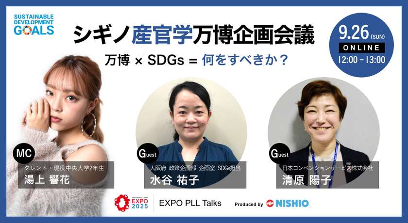 西尾レントオール株式会社と公益社団法人2025年日本国際博覧会協会が共催する「シギノ産官学万博企画会議」が、9月26日(日)YouTubeで動画配信されます。当社の2025年日本国際博覧会室エグゼクティブプロデューサー清原陽子は、ゲストスピーカーとして登壇します。