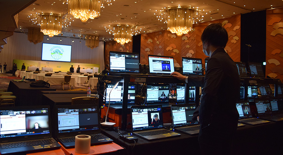 各会議の同時通訳では、SDGsなどの専門分野に長けた通訳者を手配しました。会場の同時通訳ブースとWeb会議システムを連携し、会議の様子や収録映像を配信しました。