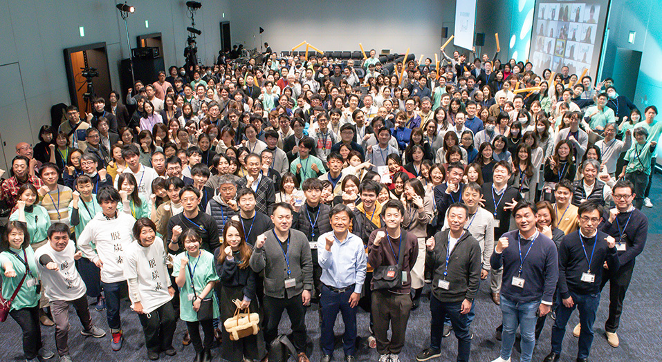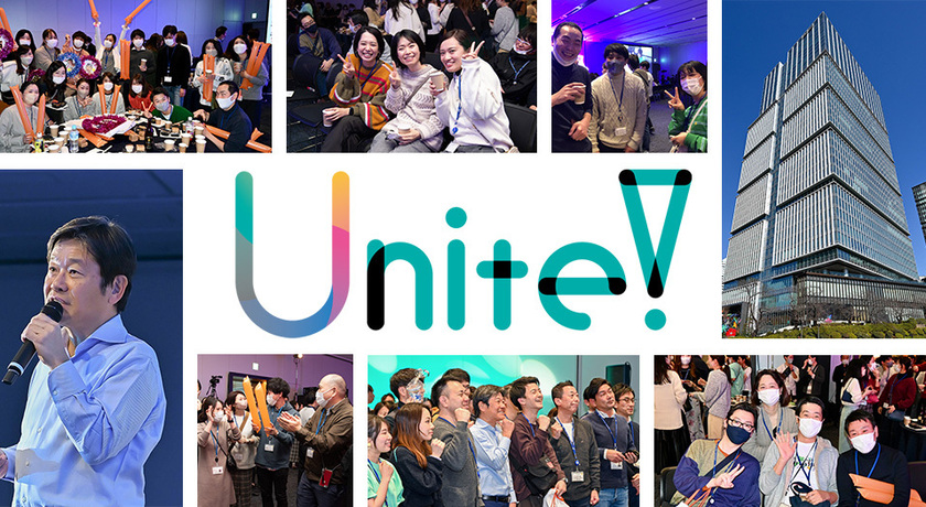 当社は社員総会を毎年 1 月に開催。2020 年までは全社員が一堂に集うリアル形式で実施していました。しかし、新型コロナウイルスの感染拡大に伴い、2021 年と 2022 年はやむなくオンライン形式で開催。このような経過を経て行われた今年の社員総会は、地方拠点や部署、世代を超えて「結束を高める」ことを目的に、「Unite!」をテーマとしました。「Unite/結束」は当社の行動理念の 1 つでもあります。