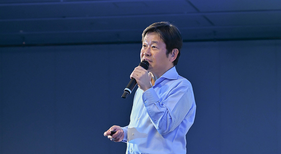 今年の社員総会は 2 部構成で開催しました。第 1 部は近浪社長からの「社長メッセージ」や若手社員による未来の新規事業のアイデアを発信する「Future Lab プレゼンテーション」。第 2 部は、社員の交流を目的に行われた、リアルとバーチャルの最新テクノロジーをかけ合わせた AR スポーツ「HADO」で会場を沸かせました。