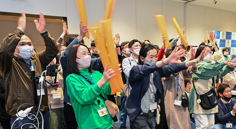 JCS では、毎年開催する社員総会を全社員の交流の場とするだけではなく、「新しい取り組みやチャレンジの場」として、最先端の演出や技術を積極的に取り入れています。社員総会はイベント企画・運営のプロである社員自らが、イノベーティブな体験をする貴重な機会でもあります。