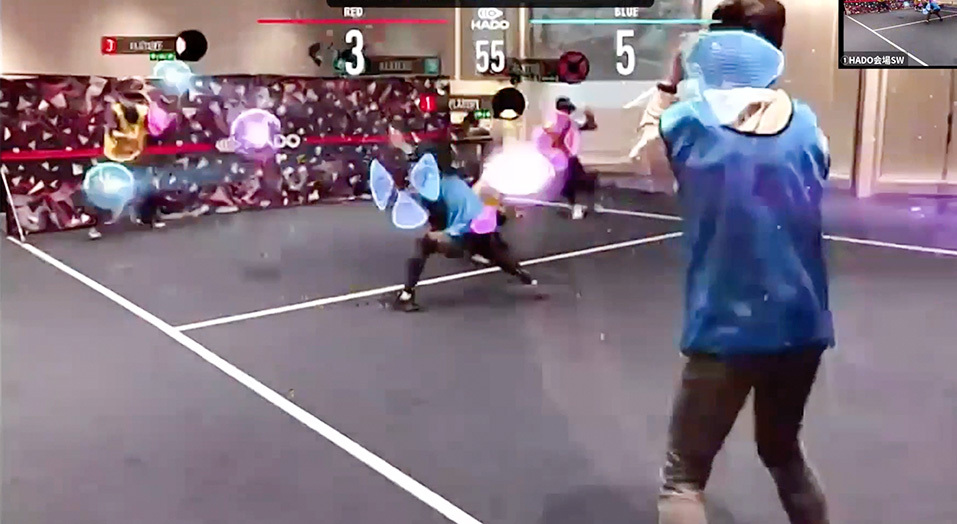 「HADO」は AR ゴーグルとアームセンサーを体に装着し、3 人 1 チームで対戦するスポーツです。