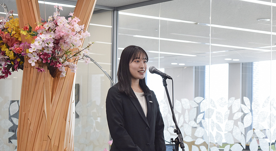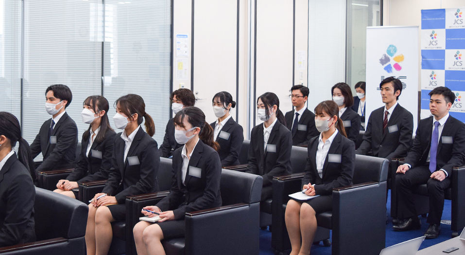 入社式では、50年以上の歴史を刻んできたJCSの沿革とコロナ禍の逆境を、社員一丸となって乗り越えてきたエピソードを近浪社長が紹介。「失敗を恐れず、自ら進んで新しいことに果敢にチャレンジしてほしい」と激励の言葉を贈りました。このほか、全役員がそれぞれの熱い期待をこめ、新入社員へ歓迎のメッセージを伝えました。新入社員の皆さんは、緊張しながらも真剣な眼差しで話に耳を傾けていました。