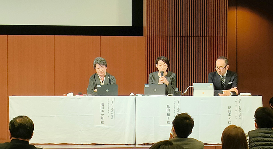 第1部では「ポストコロナにおいてMICE開催地に求められるもの」をテーマに、当社社員の秋山、池田、伊藤の3名が登壇。国内外の動向や開催地の対応について解説しました。