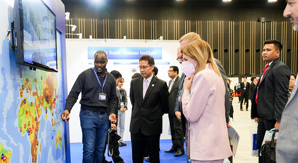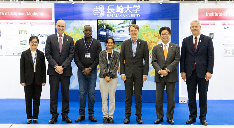 23の企業、国際機関、団体に加えて、長崎大学が参加する国際保健展示会が実施され、5月13日(土)の夕方には加藤厚生労働大臣をはじめとした各国大臣らによる展示ブースツアーが実施されました。