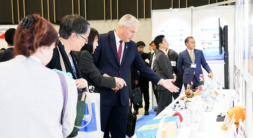 初日の加藤厚生労働大臣主催のレセプションでは、長崎の勇壮な郷土芸能である「龍踊」が、地元の女子高校の「龍踊部」の生徒の皆さんによって披露されました。また、展示ブースでは、県産品と伝統工芸品が展示され、長崎の伝統芸能や工芸品の継承に繋がる、文化振興と地域活性化の機会となりました。