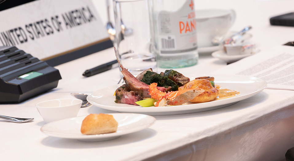 閣僚級会合を初めて開催した長崎県。ハラル食やベジタリアン食を取り入れながら地元の食材を惜しみなく使用した料理や地酒を提供しました。