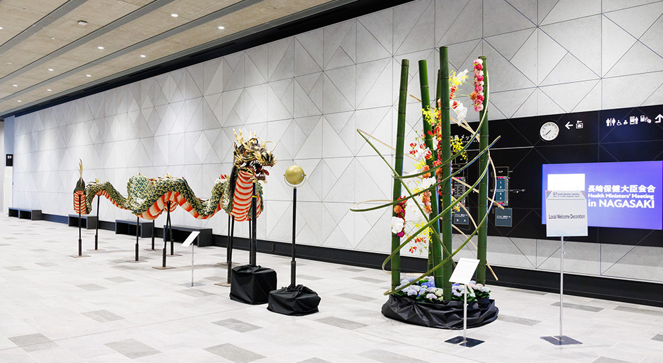 本会合の会場内では教会のステンドグラスをイメージした装飾を設けることで、広い会議空間に彩りを添えました。また、地元推進協議会にもご協力をいただき、展示会場の入口前には県産花きと龍踊(じゃおどり)の龍体が設置されるなど、会場内随所に長崎らしさを感じていただけるような装飾を施しました。