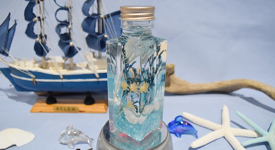 *ハーバリウム:ドライフラワーなどをガラスの小瓶に入れ、保存用の専用のオイルに浸したインテリアフラワー。