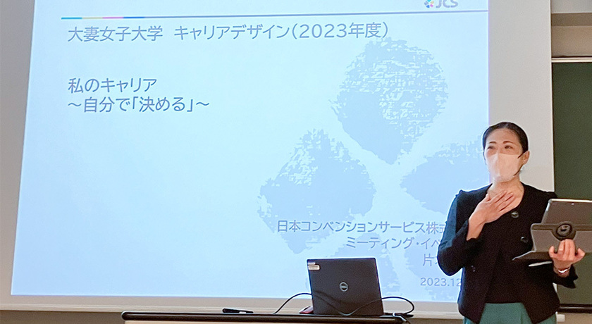 当社ミーティング・イベント部の片木が、大妻女子大学の講義「キャリアデザインⅡ・Ⅲ」で2023年12月18日(月)、ゲストスピーカーとして登壇しました。本講義は、学生の皆さんが、働く意義や就業経験について学び、社会への理解を深め、自分の将来をデザインする能力を身につけることを目的に開講されています。なお、JCSの社員は、大妻女子大学でのキャリアデザイン講座に2017年より毎年登壇しています。