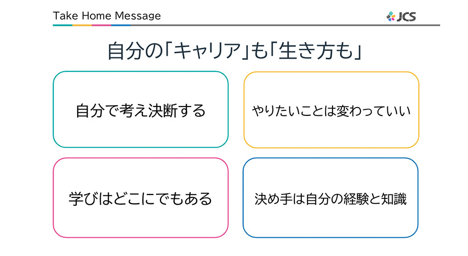 学生の皆さんからは、「『自分の経験』『自分に足りないこと』『自分のやりたいこと』を明確に自覚することが大切だと感じた」、「様々なことを経験し、何か夢中になれるものを見つけたい」などのコメントがありました。