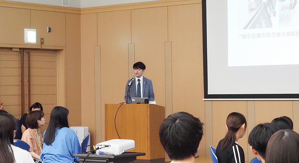 当社社員は「Professional Congress Organizer(PCO)*2の役割と業務内容について」 の講義に登壇。九州支社の社員3名が、国際会議や展示会、シンポジウム、セミナー等の各種イベントで、PCOが行う業務を紹介しました。主催する企業・団体と連携して行う会場手配・事務局代行などの事前準備、当日の運営、事後サポートなど、当社がこれまで携わってきた事例を交えながら説明しました。