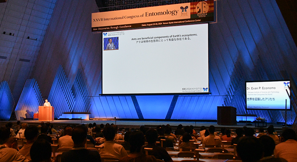 第27回国際昆虫学会議組織委員会(日本昆虫科学連合)と日本学術会議は、2024年8 月25日(日)から8月30日(金)の6日間、京都市で「第27回国際昆虫学会議(ICE2024 Kyoto)」を開催しました。本会議は、昆虫学全般にわたる最も包括的な国際会議で、82か国・地域から4,000名以上(一般参加者を含む)が参加。4年に一度開かれることから昆虫学者のオリンピックとも言われ、世界中の昆虫学者が一堂に会する本会議の運営全般を、JCSは担当しました。