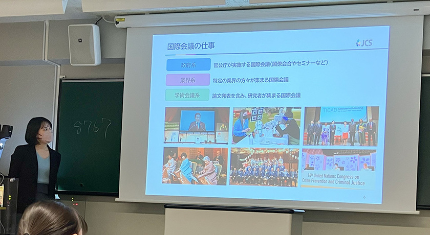 当社国際会議部の中井が、大妻女子大学の講義「キャリアデザインⅡ・Ⅲ」で2024年12月9日(月)、ゲストスピーカーとして登壇しました。本講義は、学生の皆さんが、働く意義や就業経験について学び、社会への理解を深め、自分の将来をデザインする能力を身につけることを目的に開講されています。なお、JCSの社員は、大妻女子大学でのキャリアデザイン講座に2017年から毎年登壇しています。