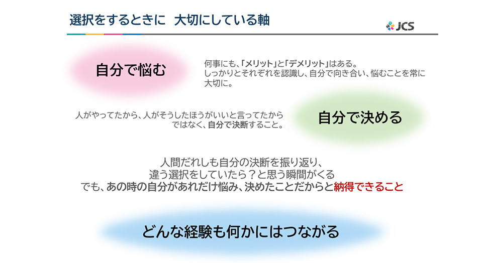 学生の皆さんからは、「自分で悩み、自分で決断することの大切さを学んだ」、「『やりたいことは変わってもいい』という言葉に後押しされた」、「どんな環境でも『これも経験』とポジティブに切り替えていきたい」などのコメントがありました。