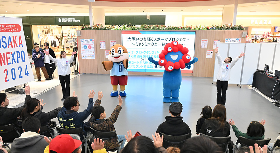 また、大阪・関西万博に向けた認知拡大と来場意欲の醸成を目的に、ミャクミャクと公式ダンスを踊るプログラムも各イベントで実施しました。