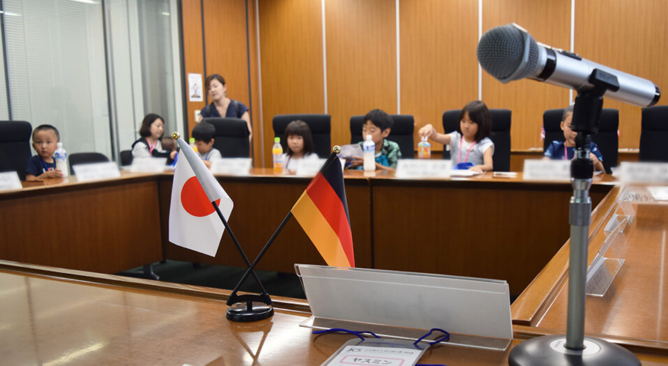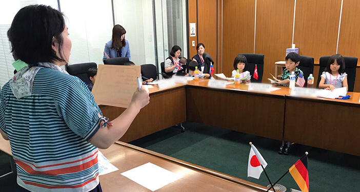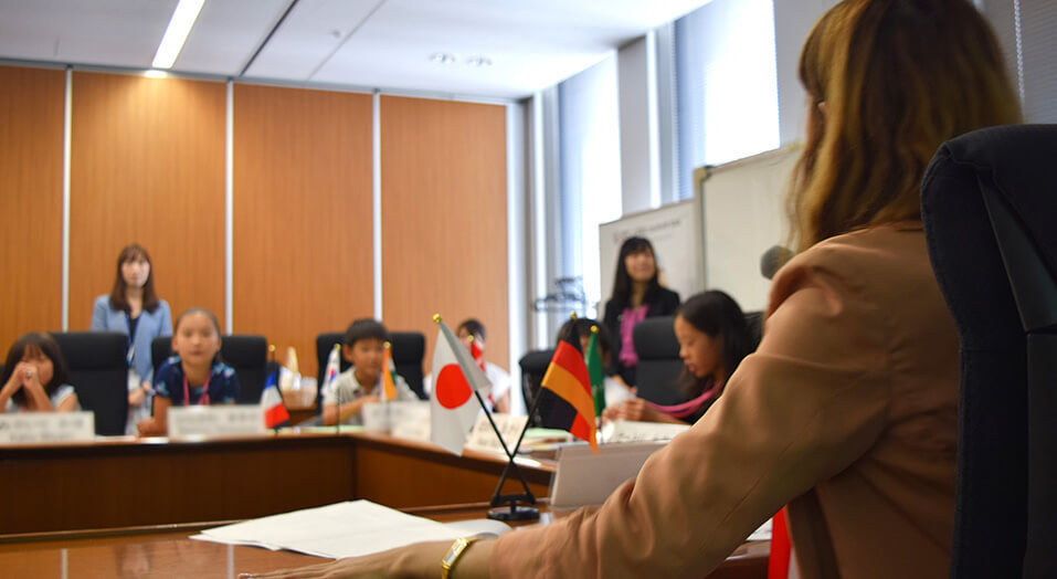 次に、こども達は「国際会議」の役割を知るためのレクチャーを受けます。世界各国の代表者は、様々なテーマについて他国と意見交換し、自国の意見を発表して問題解決に務めています。今日は、この大切な役目を担うため、自分の意見をまとめる仕事から取り掛かります。